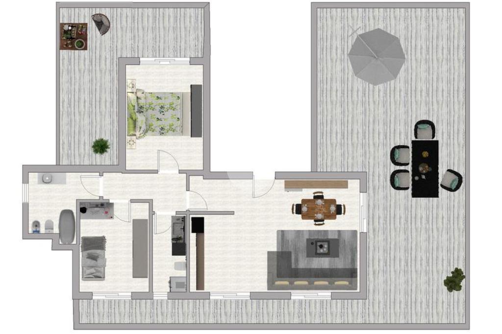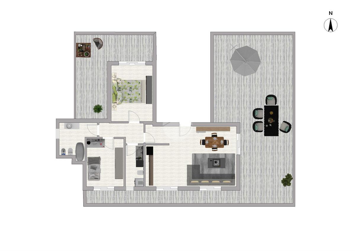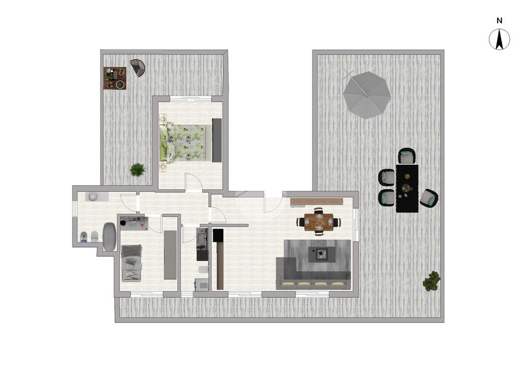 L’ingresso avviene nella luminosa zona giorno composta dal soggiorno open - space con angolo cottura che affaccia sulla terrazza di circa 105 mq con esposizione verso nord-ovest.