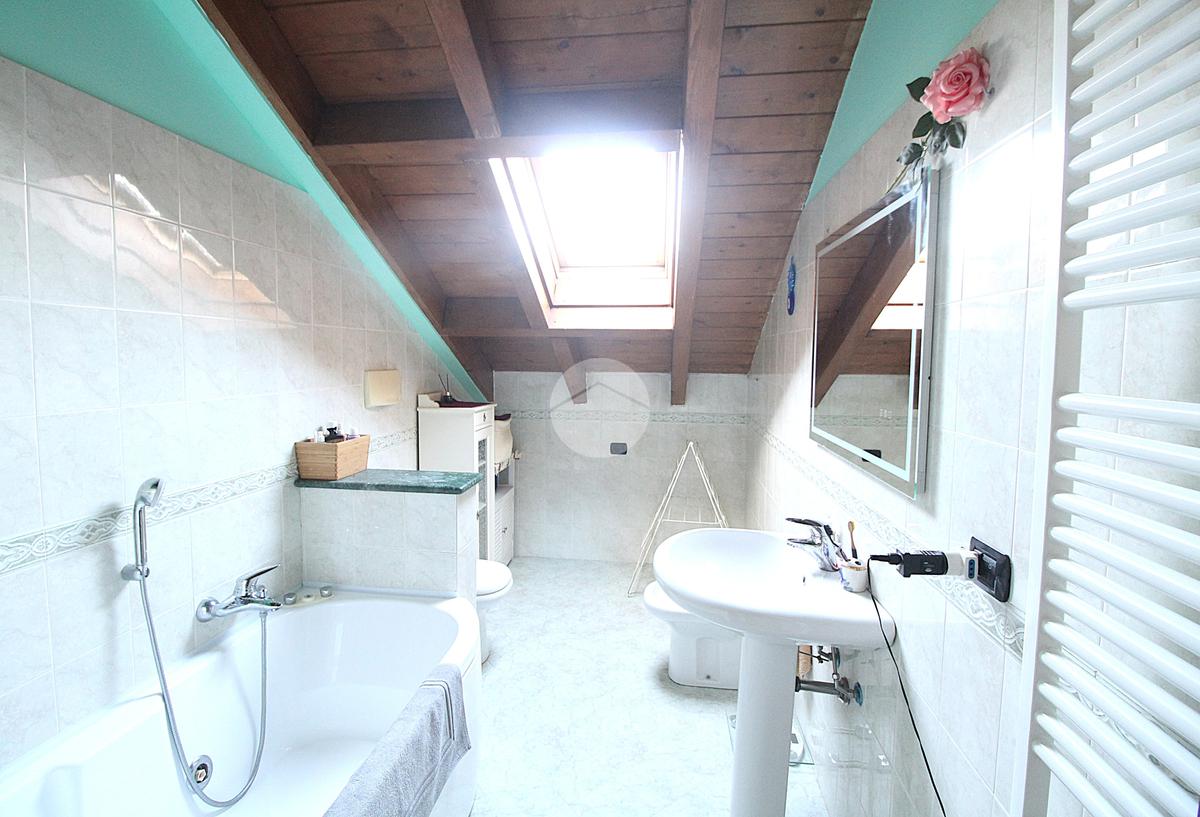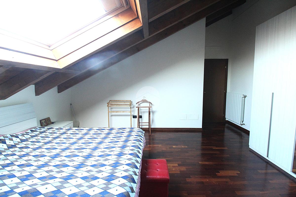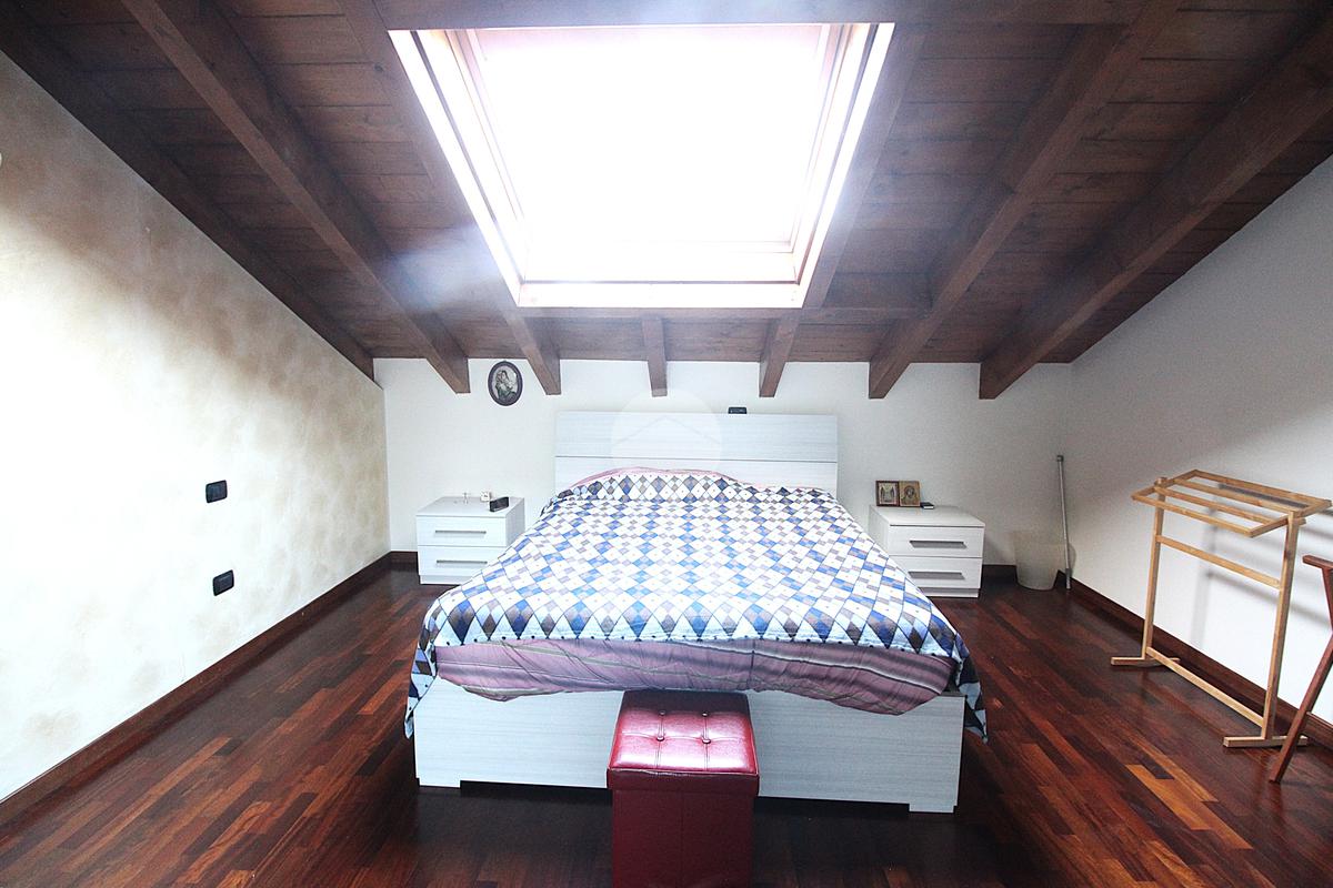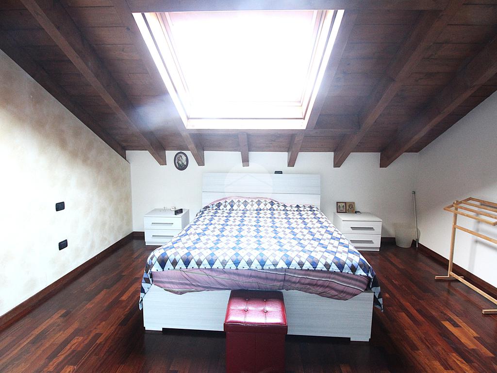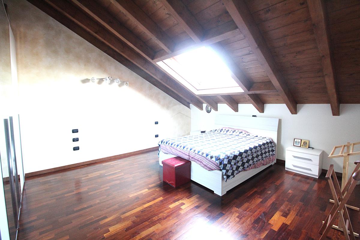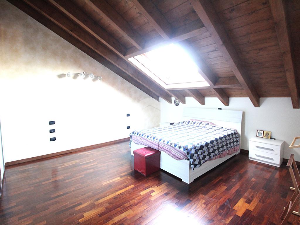 Tramite l’elegante scala interna si accede al piano mansardato, caratterizzato da travi a vista, composto dalla camera matrimoniale, dalla cameretta e dal bagno finestrato accessoriato dalla vasca da bagno.
