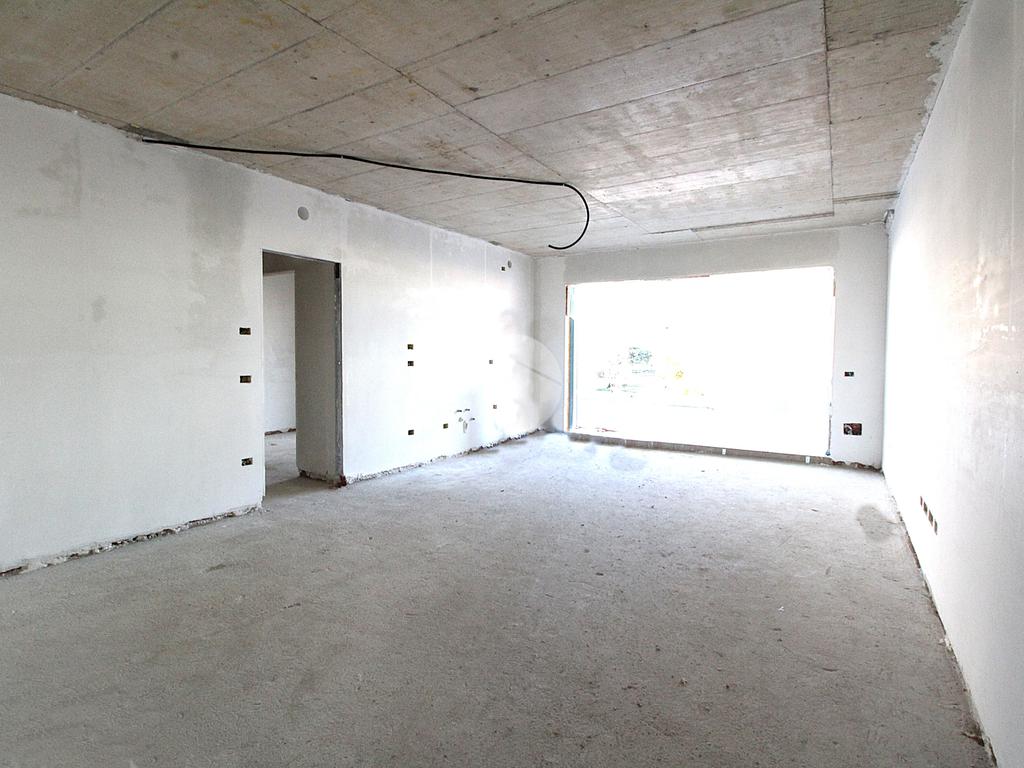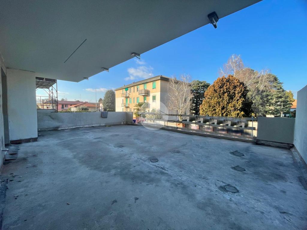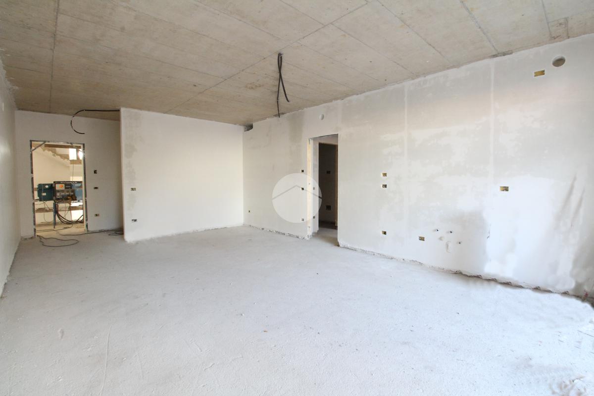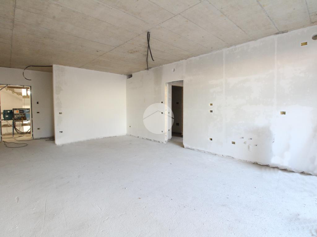 L’ingresso avviene nella luminosa zona giorno open space con angolo cottura, caratterizzata da un'ampia vetrata che affaccia sul terrazzo vivibile di 70 mq.