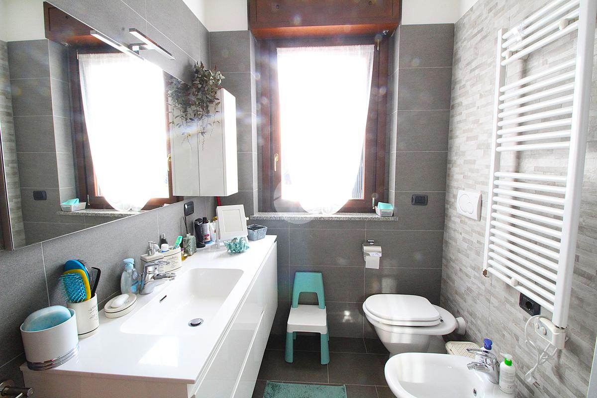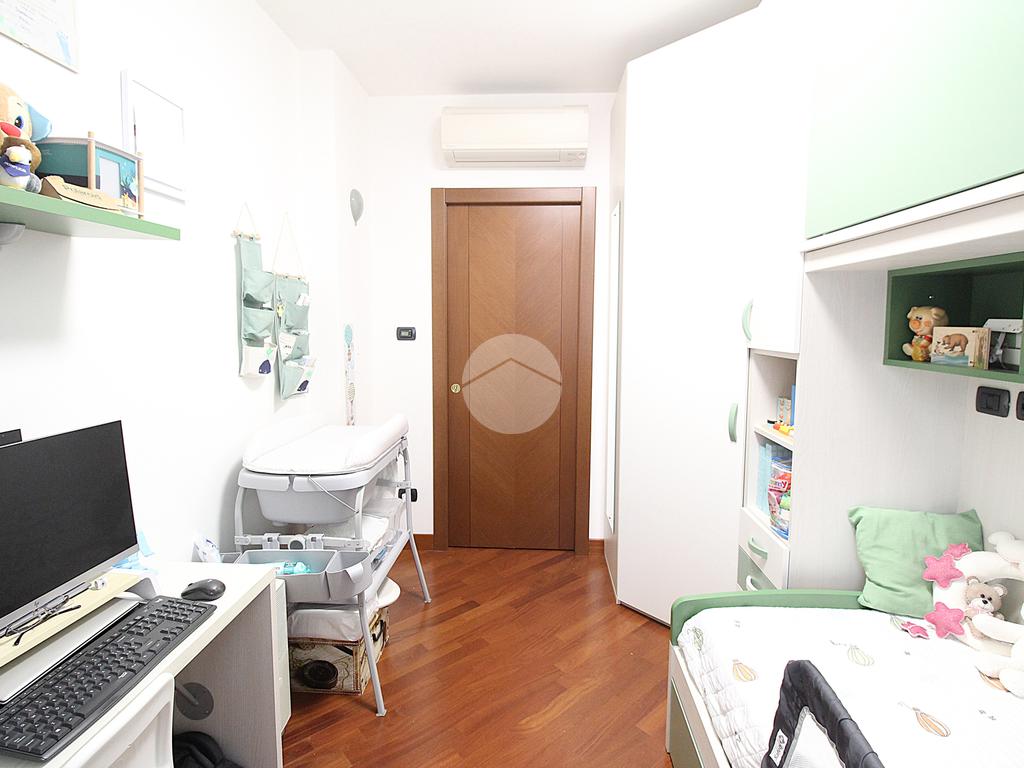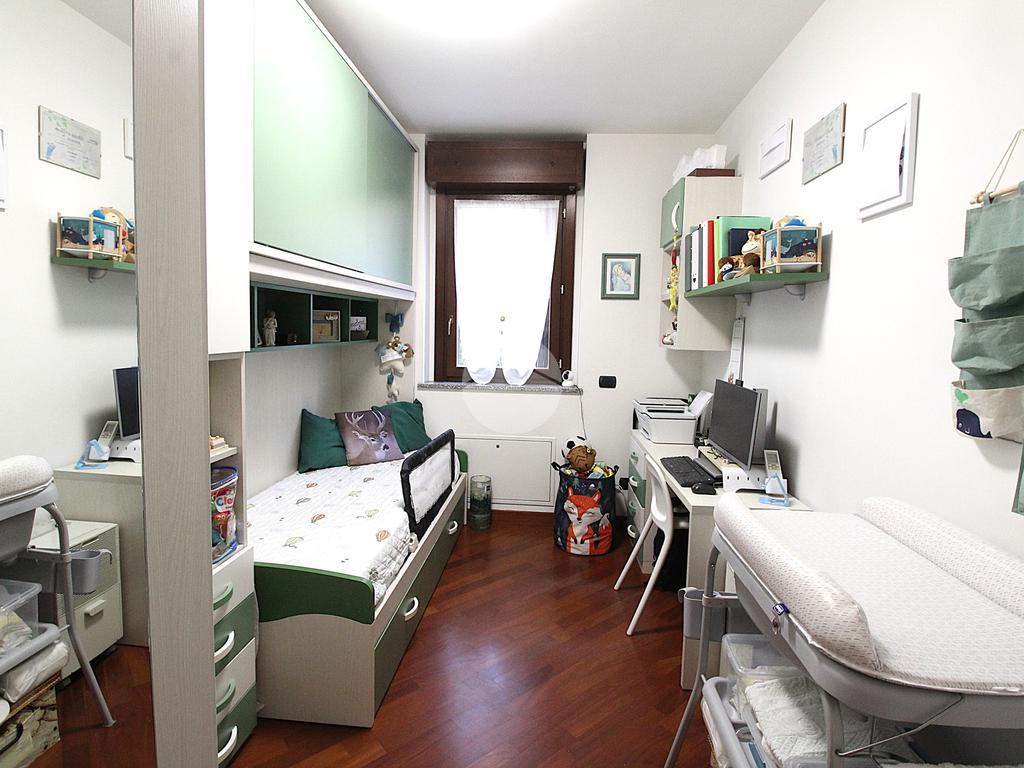 Tramite il disimpegno armadiato su misura si accede alla zona notte dove troviamo la camera matrimoniale, la cameretta e il bagno finestrato accessoriato dal box doccia.
